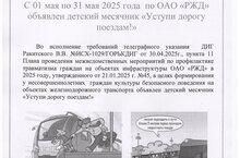 С 01 мая по 31 мая 2025 года по ОАО "РЖД" объявлен детский месячник "Уступи дорогу поездам!"