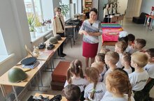 Директор музея, Ашрафзянова Фарида Салимзяновна, совместно с учащимися 7-х классов и юнармейцами провели экскурсию. В доступной форме рассказали ребятам о истории школы, происходящих событиях и современных героях. Маленькие кадеты ответили, как они понимают смысл слов патриотизм и долг перед родиной. Руководитель музея показала ребятам экспонаты Великой Отечественной Войны, Советского Союза, малыши примерили галстук пионера.