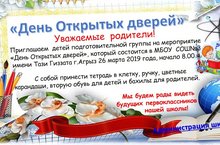 Приглашаем детей подготовительной группы на мероприятие "День открытых дверей", котороый состоится в МБОУ СОШ №3 имени Тази Гиззата г.Агрыз 26 марта 2019 года, начало в 8.00 ч.