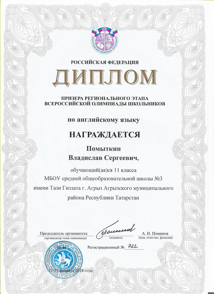 С 11 по 14 февраля 2018 года в г. Казань состоялся республиканский этап Всероссийской олимпиады по английскому языку. Агрызский район достойно представил ученик 11 класса СОШ№3 им. Т.Гиззата г. Агрыз Помыткин Владислав и стал призером! Мы поздравляем Помыткина Владислава и его учителя Исмагилову Ольгу Ивановну с победой! Выражаем благодарность за труд и гордимся Вами!