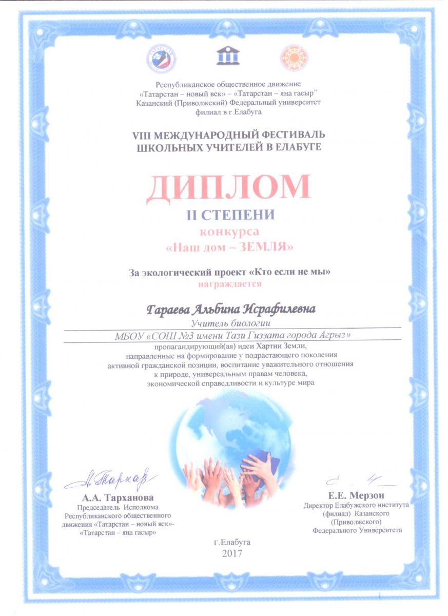 На VIII Международном фестивале школьных учителей был подведен итог конкурса "Наш дом - Земля", где с экологическим проектом "Кто если не мы" была награждена Гараева Алшьбина Исрафиловна дипломом II степени.