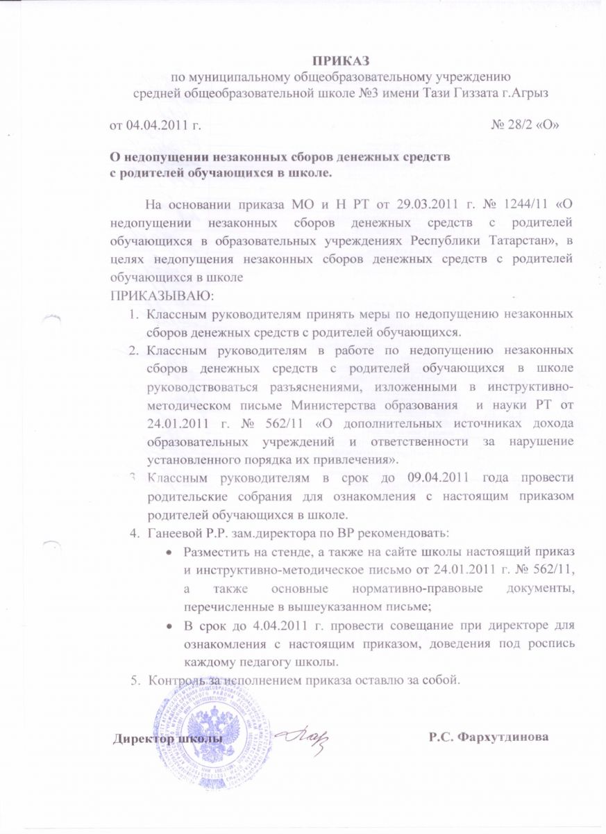 Приказ о недопущении незаконных сборов денежных средств с родителей обучающихся в школе