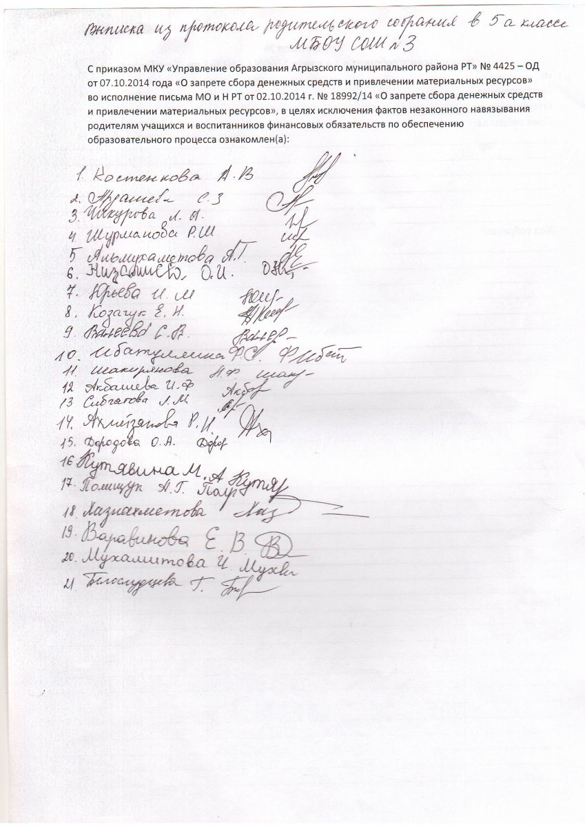 Выписка из протокола родительского собрания в 5 а классе. Классный руководитель Исмагилова О.И.