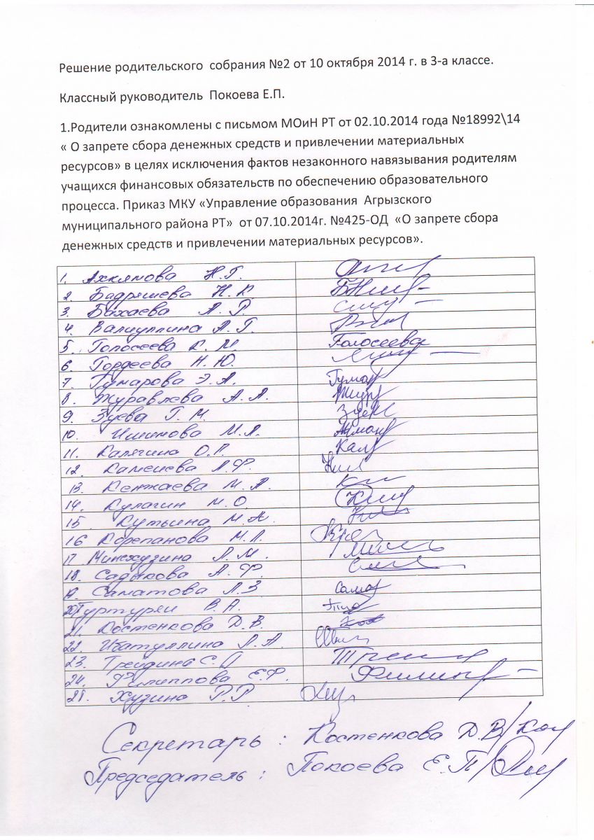 Выписка из протокола родительского собрания в 2 б классе. Классный руководитель Фатыхова О.В.