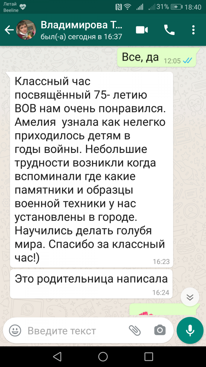 Дети с уверенностью ответили, что наши ветераны ценой своей жизни и героическими подвигами подарили нам мирную жизнь, чистое небо. В конце классного часа учащиеся изготовили голубь мира.