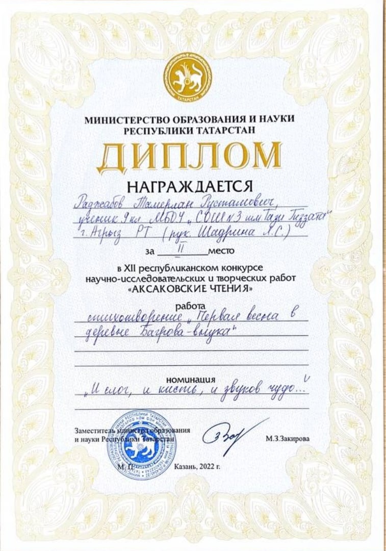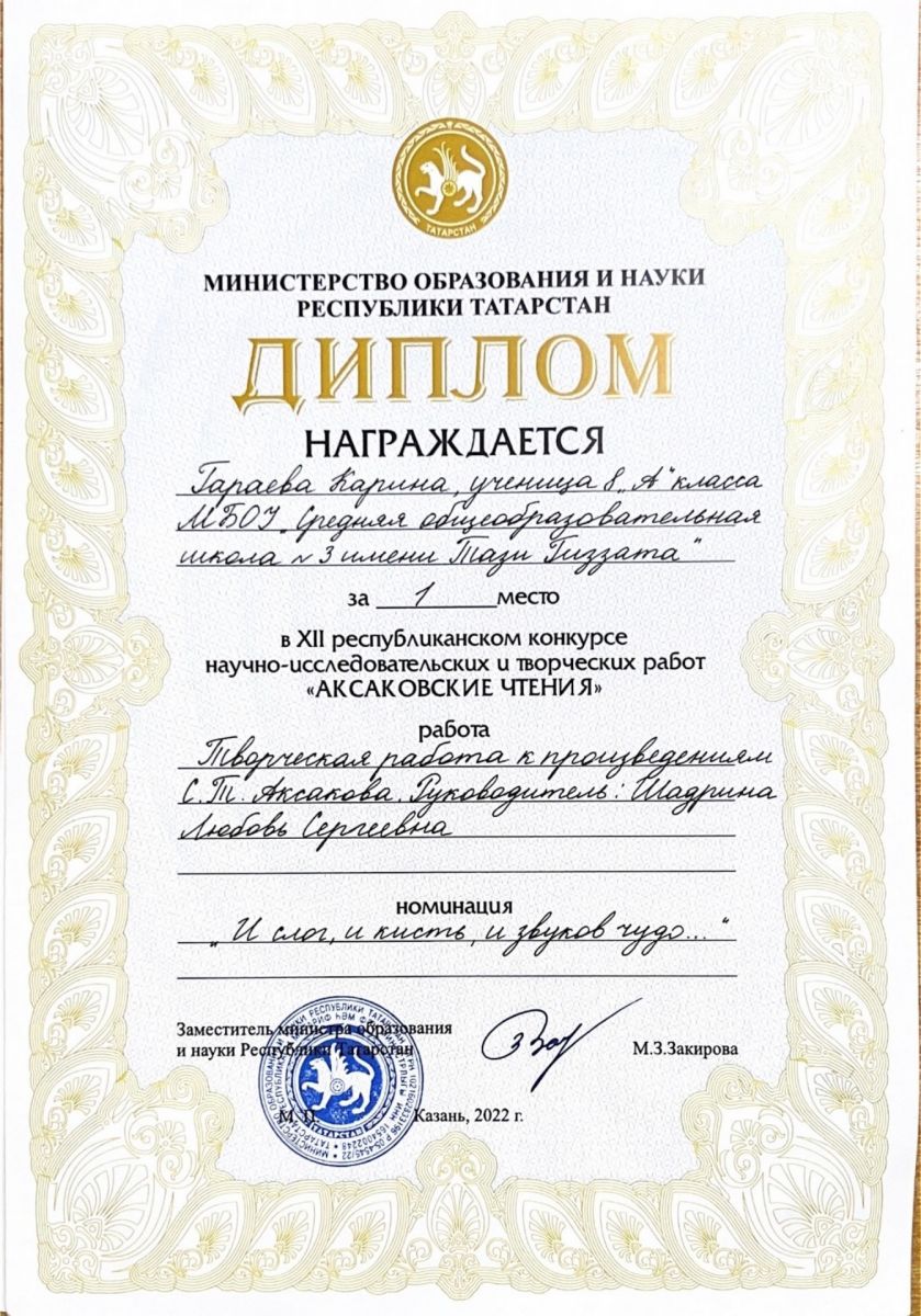 По итогам XII республиканского конкурса научно-исследовательских и творческих работ "Аксаковские чтения" Гараева Карина стала победителем, Раджабов Тамерлан - призёром!