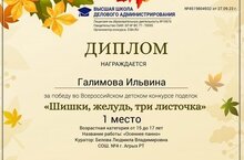 Поздравляем Галимову Ильвину за победу во Всероссийском конкурсе поделок из бросового материала "Шишки, желудь, три листочка"!
