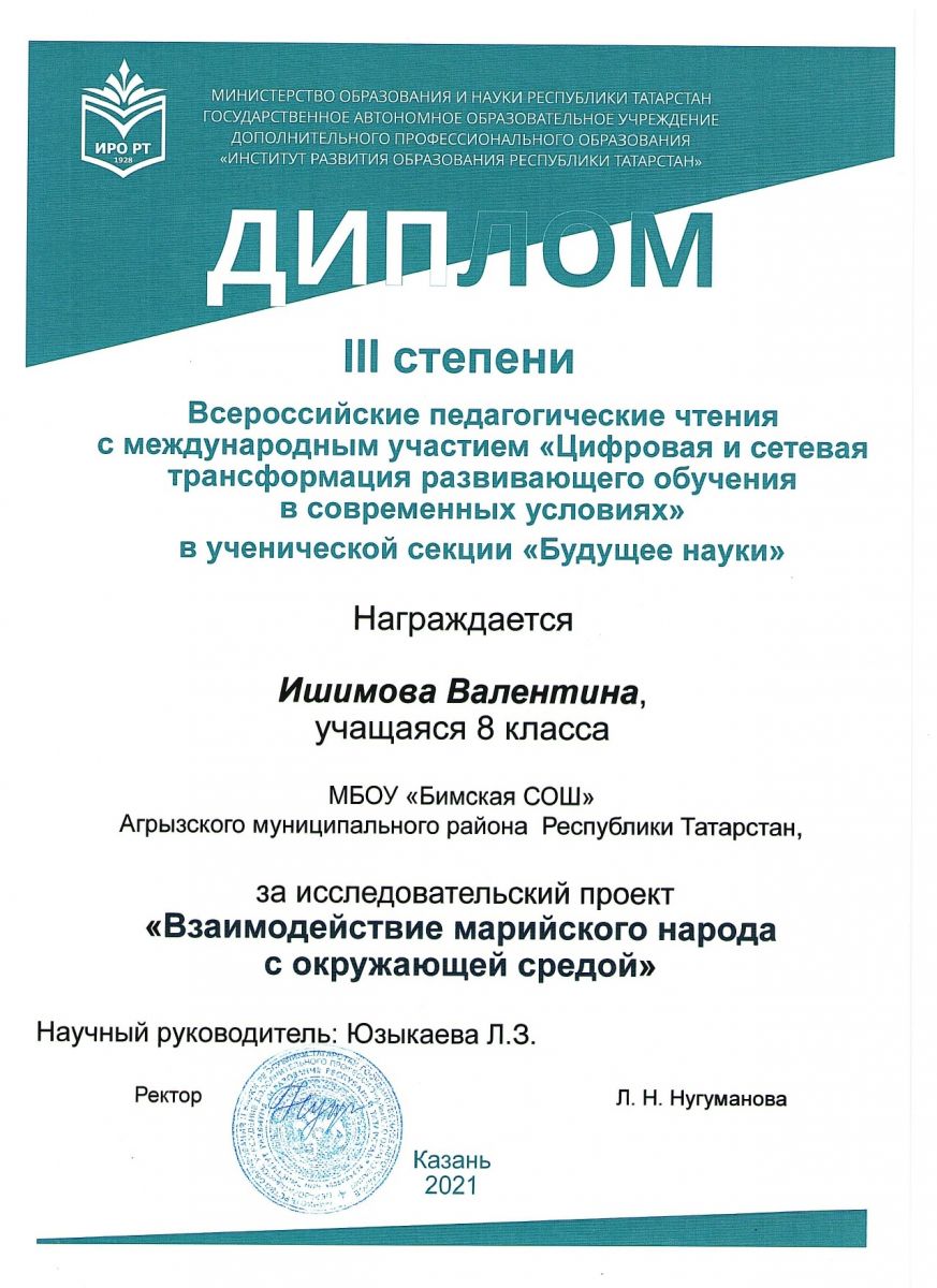 Опубликовано: 22.12.2021Учащиеся Бимской школы приняли участие в ученической секции во Всероссийских пед чтениях с международным участием "Цифровая и сетевая трансформация развивающего обучения в современных условиях" и стали призёрами. Подготовили девушек учителя Самуткина Е. Г. и Юзыкаева Л.З