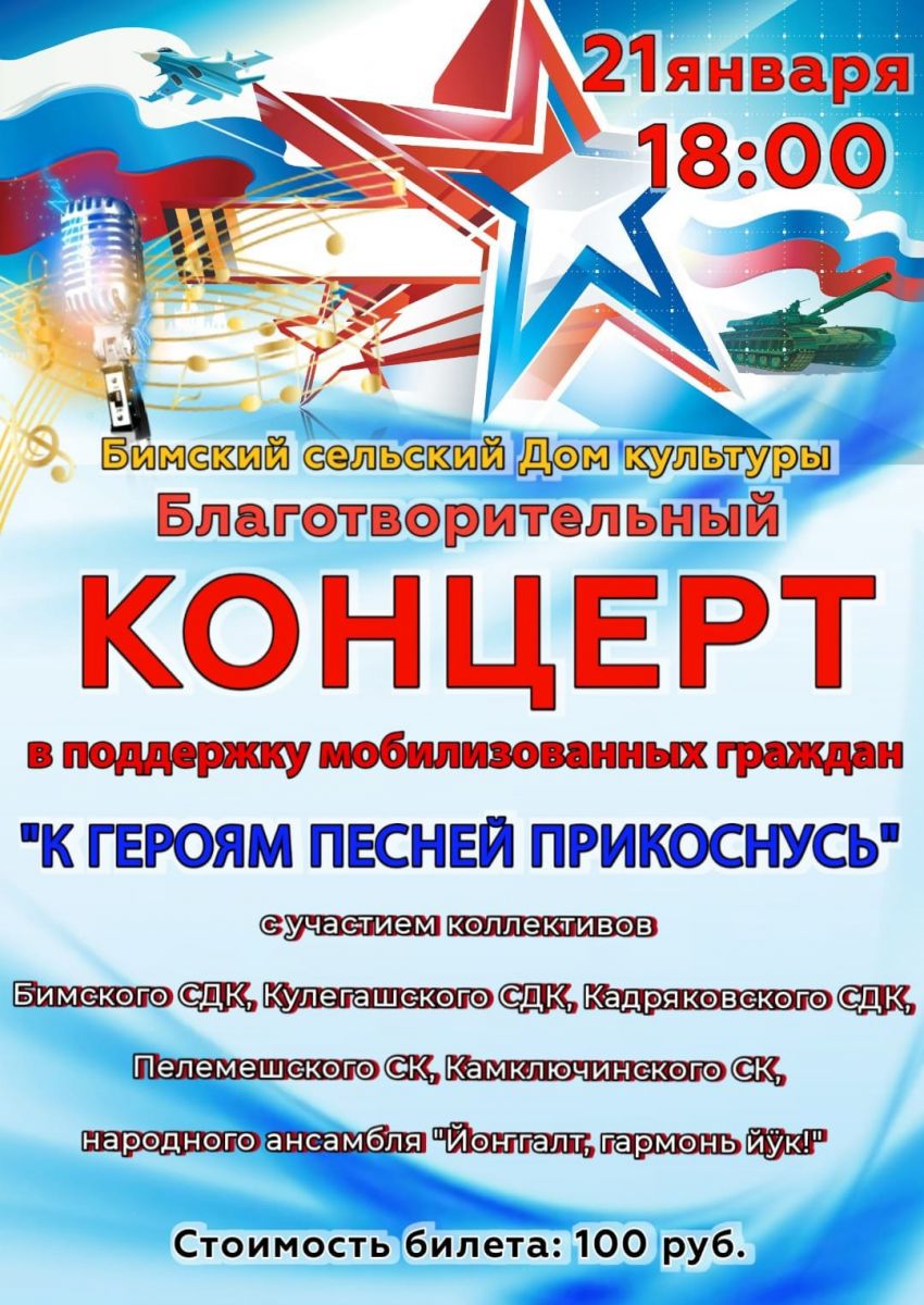 Опубликовано: 23.01.202321 января в Бимском СДК прошел благотворительный патриотический концерт в поддержку участников СВО. В данном мероприятии активное участие приняли участие и учащиеся Бимской школы