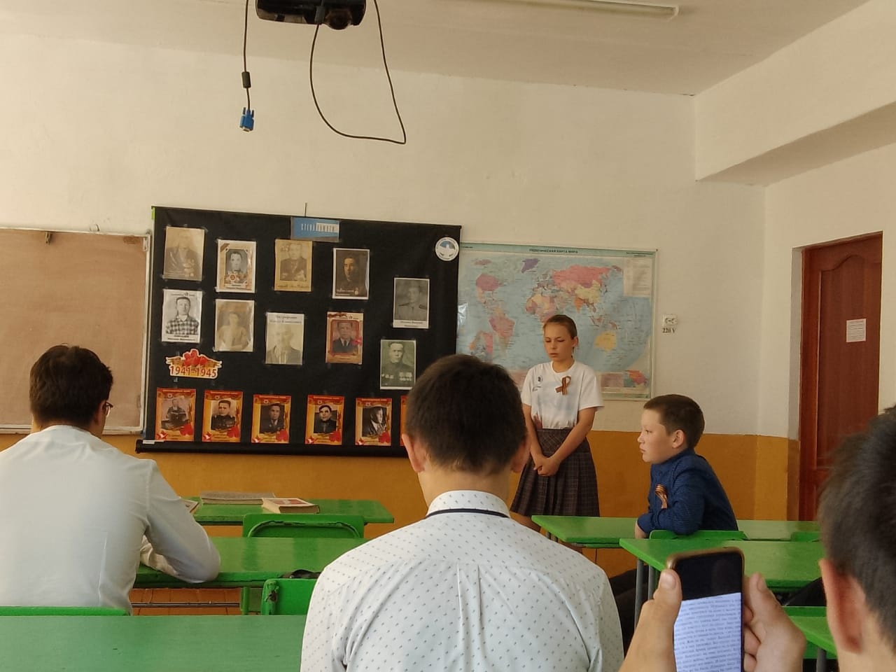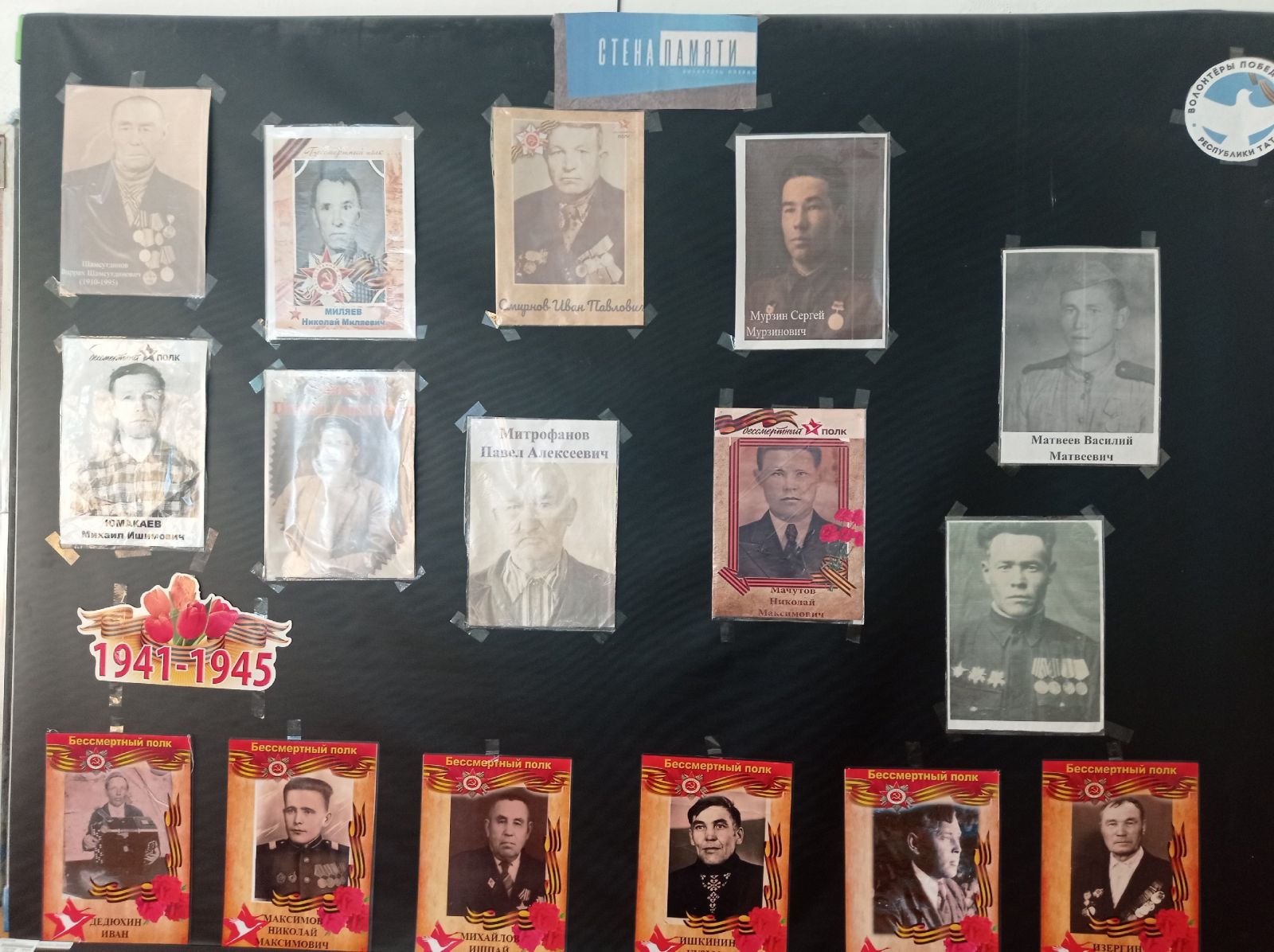 Опубликовано: 04.05.2023В 2023 году традиционный Бессмертный полк проходит в другом формате. Одним из видов является «Стена Памяти» Учащиеся 8б класса под руководством классного руководителя Юзыкаевой Л.З. создали стену памяти класса. Ребята распечатали портреты своих родственников, и, почтив память, разместили их рядом с другими ветеранами. Каждый учащийся рассказал о судьбе своего родственника. Так же Стена Памяти создана в школьном историко-краеведческом музее, где собраны все фотографии, которые нам удалось найти.