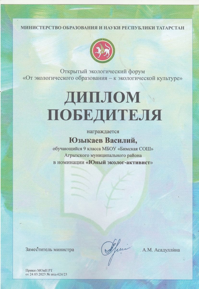 Форум «От экологического образования – к экологической культуре» . где принял участие обучающийся 9 класса Бимской СОШ Юзыкаев Василий, по итогам экологической деятельности он признан победителем. Поздравляем Василия, желаем новых творческих успехов.
