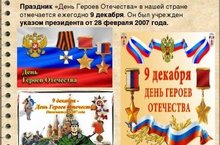 9 декабря наша страна отмечает праздник "День Героев Отечества". Эта памятная дата была установлена в 2007 году. День 9 декабря был выбран не случайно. До 1917 года он был посвящён чествованию заслуг георгиевских кавалеров. В настоящее время страна чествует Героев Советского Союза, кавалеров ордена Святого Георгия и ордена Славы, Героев Социалистического труда, Героев Российской Федерации. Герой - это человек, совершивший или совершающий благородные поступки, связанные с риском для его жизни. А "Родина наша - колыбель героев, огромной горы, где плавятся простые души, становясь крепкими, как алмаз и сталь, вечными как огонь" ( А.Н.Толстой)