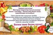 Хөрмәтле укытучылар, өстәмә белем бирү педагоглары, мәгариф ветераннары! Тормышта һәркемнең зирәклеге, күңел байлыгы, тирән белеме аша дөньяны танып белергә һәм киләчәкне күзалларга өйрәтүче мөхтәрәм кешесе – Укытучысы була. Нәкъ менә укытучының һөнәри осталыгы, үз эшенә бирелгәнлеге һәм кешелеклелек сыйфатлары аша бала язмышы, шәһәребез һәм республикабызның киләчәге хәл ителә, чөнки мәгарифтә барган һәртөрле яңарышлар чорында укытучы шәхес тәрбияләүдә әйтеп бетергесез мөһим роль уйный. Әлеге күркәм бәйрәм – Халыкара укытучылар көнендә күңел түреннән чыккан иң изге теләкләрне, иң җылы хисләрне кабул итегез! Һөнәрегезгә һәрчак тугры булуыгыз, күңел сафлыгыгыз һәм тырышлыгыгыз өчен зур рәхмәт сезгә! Мәктәбебезнең мәгариф үсешенә һәм яшь буынны тәрбияләүгә зур өлеш кертүче укытучыларыбызга аерым рәхмәтебезне белдерәбез. Мәктәбебез мөгаллимнәре мәгариф өлкәсендәге казанышлары, тирән белемле, тырыш, укучыларга карата кайгыртучан, игътибарлы булулары белән һәрчак аерылып торалар һәм киләчәктә дә үз эшләренә тугры калырлар дип ышанабыз. Барыгызга да исәнлек-саулык, күңел күтәренкелеге, зур уңышлар, бетмәс-төкәнмәс энергия, эшегездә яңа үрләр яулавыгызны телибез! Сезнең һәр дәресегез укучыларны яңа белемнәргә, фәнни ачышларга этәрсен! Тормыш сезгә һәм укучыларыгызга бары тик “бишле” билгеләре генә куйсын!