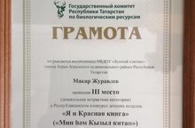 Поздравляем воспитанника, Журавлева Макара, с 3 местом в Республиканском конкурсе детских поделок "Я и Красная книга" (воспитатель Закирова Гульшат Фирдависовна)! Желаем дальнейших творческих успехов!