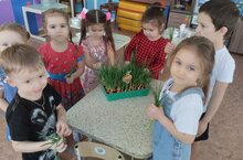 Средняя группа N7 вырастила у себя на окошке зелёный лук (воспитатель Галимарданова Р. Р.