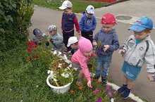 Первая младшая группа N5 за наблюдением цветов на территории детского сада (воспитатель Шарафиева В. Ф.) -