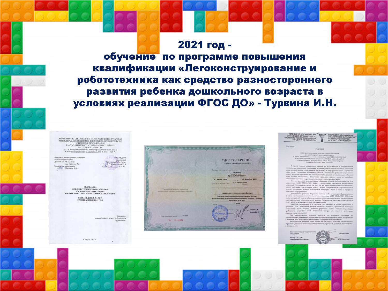 - 2021 год - обучение по программе повышения квалификации «Легоконструирование и робототехника как средство разностороннего развития ребенка дошкольного возраста в условиях реализации ФГОС ДО» - Турвина И.Н