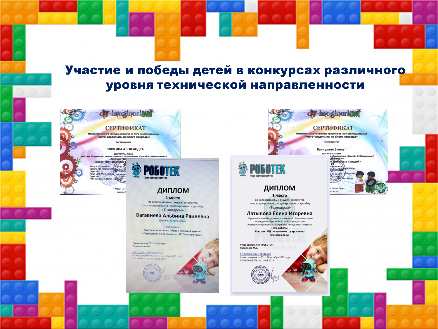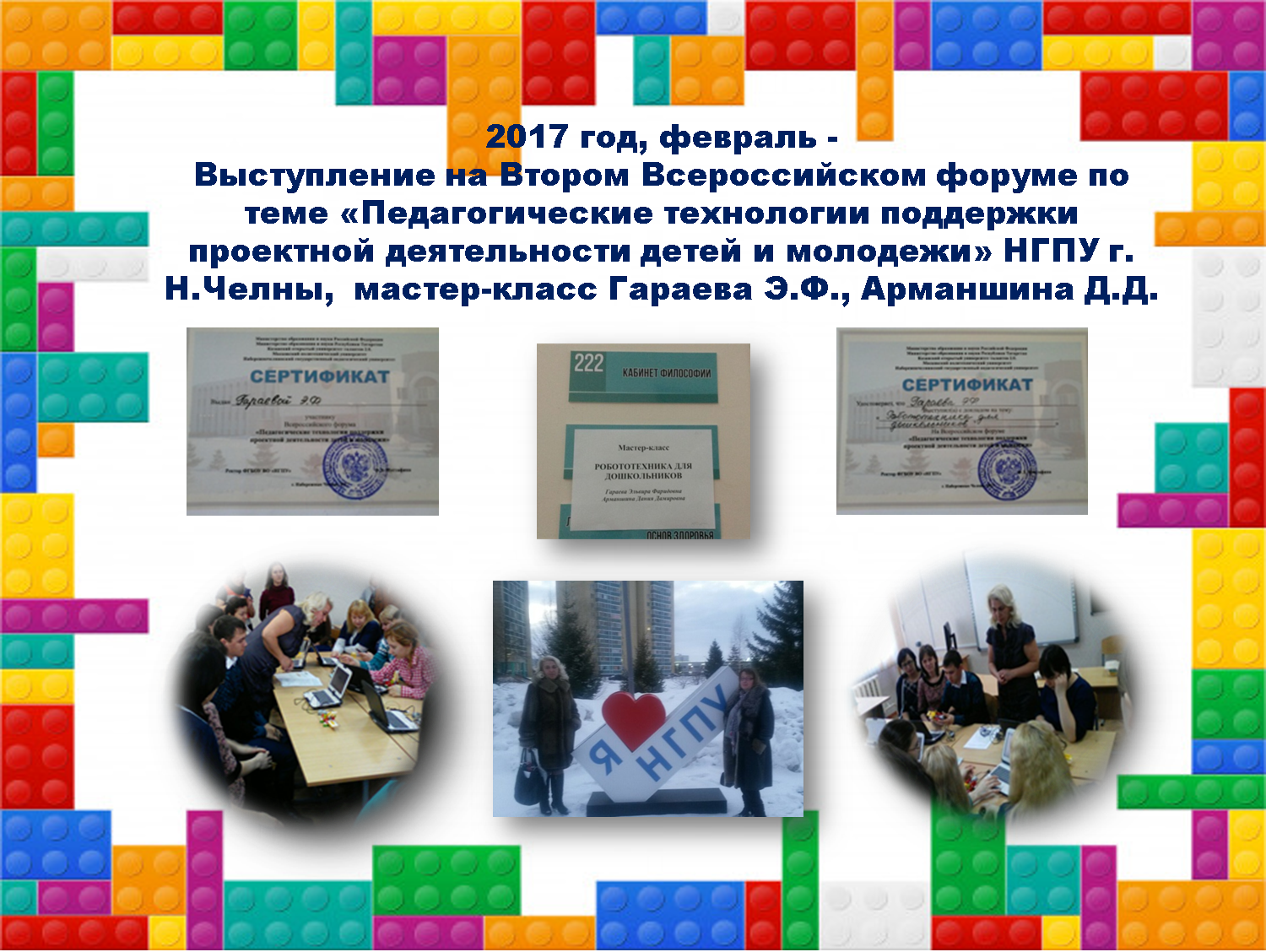 - 2017 г - шестой форум педагогических работников Республики Татарстан «Я реализую ФГОС» Образовательные стандарты 21 века: вызовы и решения, стендовая выставка по реализации инновационного проекта ««Лего-конструирование как условие успешной социализации дошкольника»