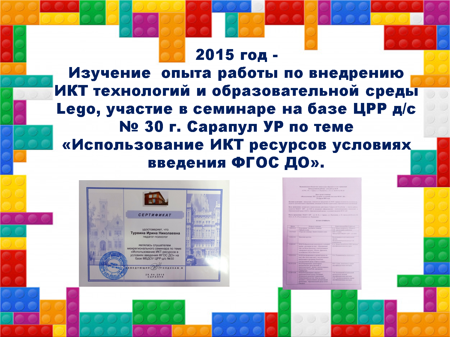 - 2015 год - Изучение опыта работы по внедрению ИКТ технологий и образовательной среды Lego, участие в семинаре на базе ЦРР д/с № 30 г. Сарапул УР по теме «Использование ИКТ ресурсов условиях введения ФГОС ДО»