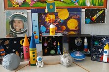Интересно и познавательно прошел день космонавтики в подготовительной группе. Беседы, игры, рисование и посещение выставки "Загадочный космос" в старшей группе.