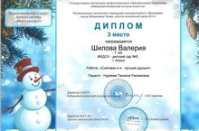 Воспитанница средней группы Шилова Валерия заняла 3 место в межрегиональном конкурсе рисунков "Мой Снегодруг".Поздравляем с хорошим результатом и желаем дальнейших побед!