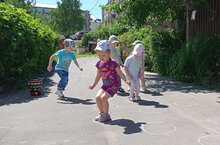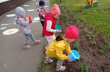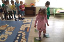 Дети в первой младшей группе продолжают знакомиться с экологией. Воспитанники весело играют в подвижные игры "С кочки на кочку", "Солнышко и дождик", "Догонялки" и др.