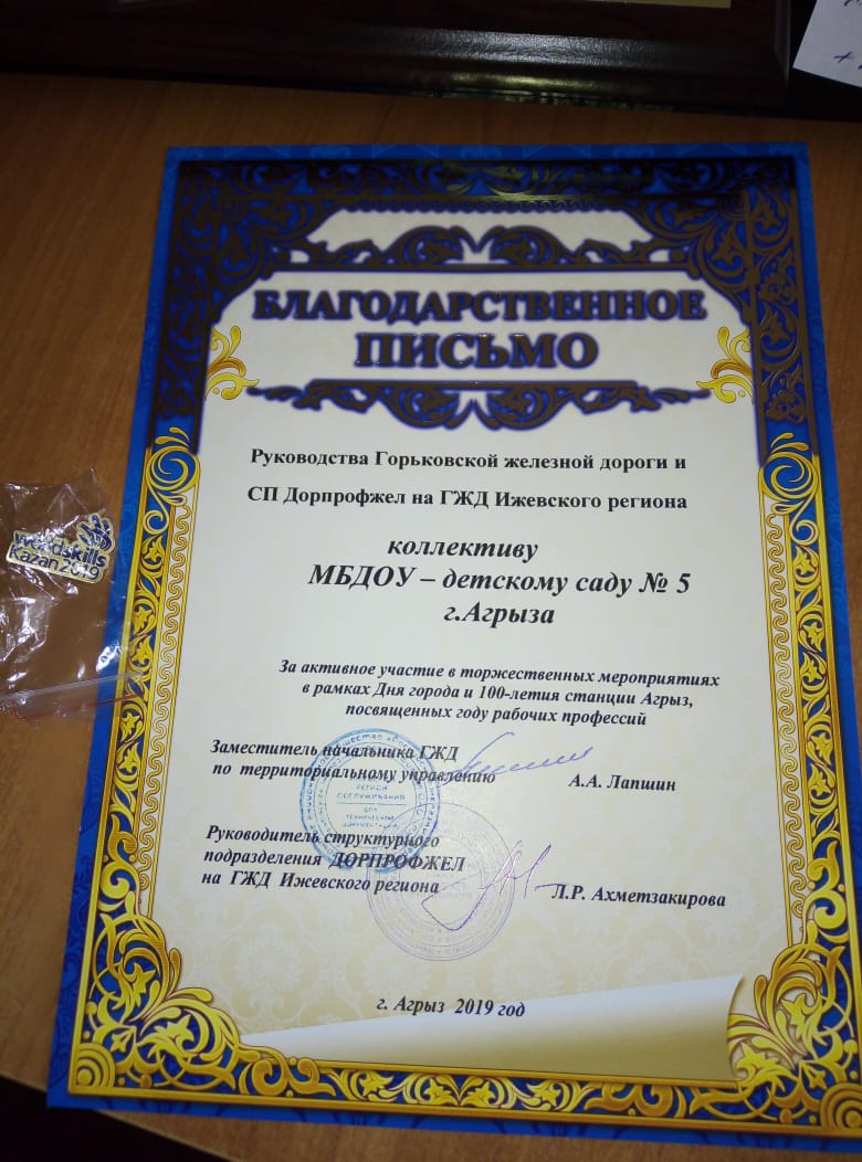 Благодарность заместителя начальника ГЖД по территориальному управлению АА.Лапшин