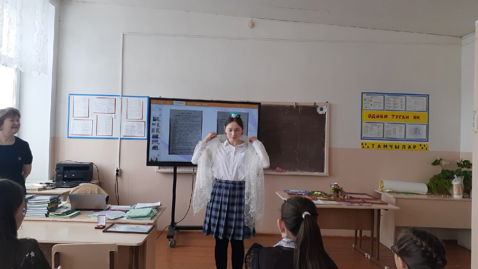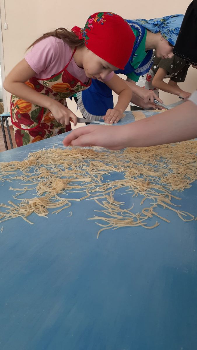 "Ак калфак" бәйгесендә катнашып 2 нче урынга лаек булган Латыйпова Энҗе мәктәбебезнең укучы кызларын бәйге шартлары һәм үткәрелүе белән таныштырып китте. Бәйге барышында үткән сынауларның берсе -токмач басу һәм кисү иде. Укучы кызлар бүген бу эштә көчләрен сынап карадылар.