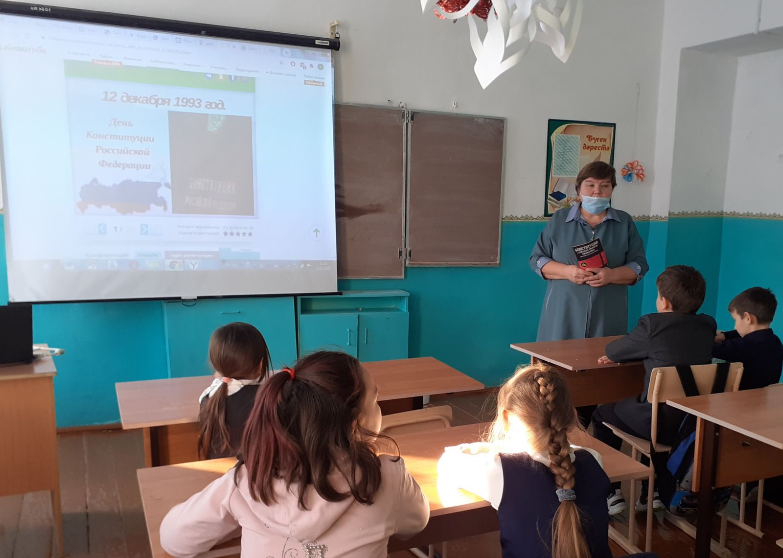 - в младших классах учитель изобразительного искусства Гафарова З.Г. подвела итог школьному конкурсу рисунков на тему: Конституция глазами детей".Лучших наградили грамотами администации школы.