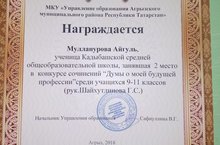 Ученица 9 класса Мулланурова Айгуль Илфатовна заняла 2 место в районном конкурсе сочинений " Думы о моей будущей профессии" среди учащихся 9-11 классов.Руководитель Шайхутдинова Г.С. Поздравляем!
