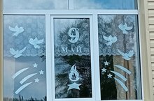 Ребята украсили окна праздничными рисунками, журавлями, тянущимися к небу, салютами, цветами, шариками, звездочками, портретами героев Великой Отечественной войны.