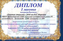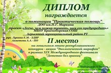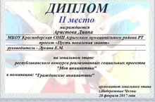 За проект "Пусть поколения знают" ,выполненный под руководством Лукиной Е.М. Аристова Диана получила 2 место на зональном этапе республиканских конкурсов реализованных социальных проектов в номинации "Гражданская инициатива". Этот же проект Диана защищала в г.Казани и получила свидетельство участника .