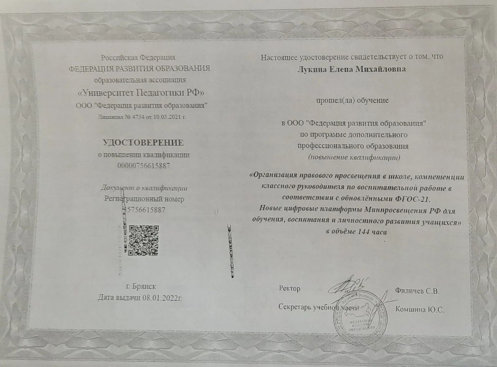 Удостоверение курсы классного руководителя.