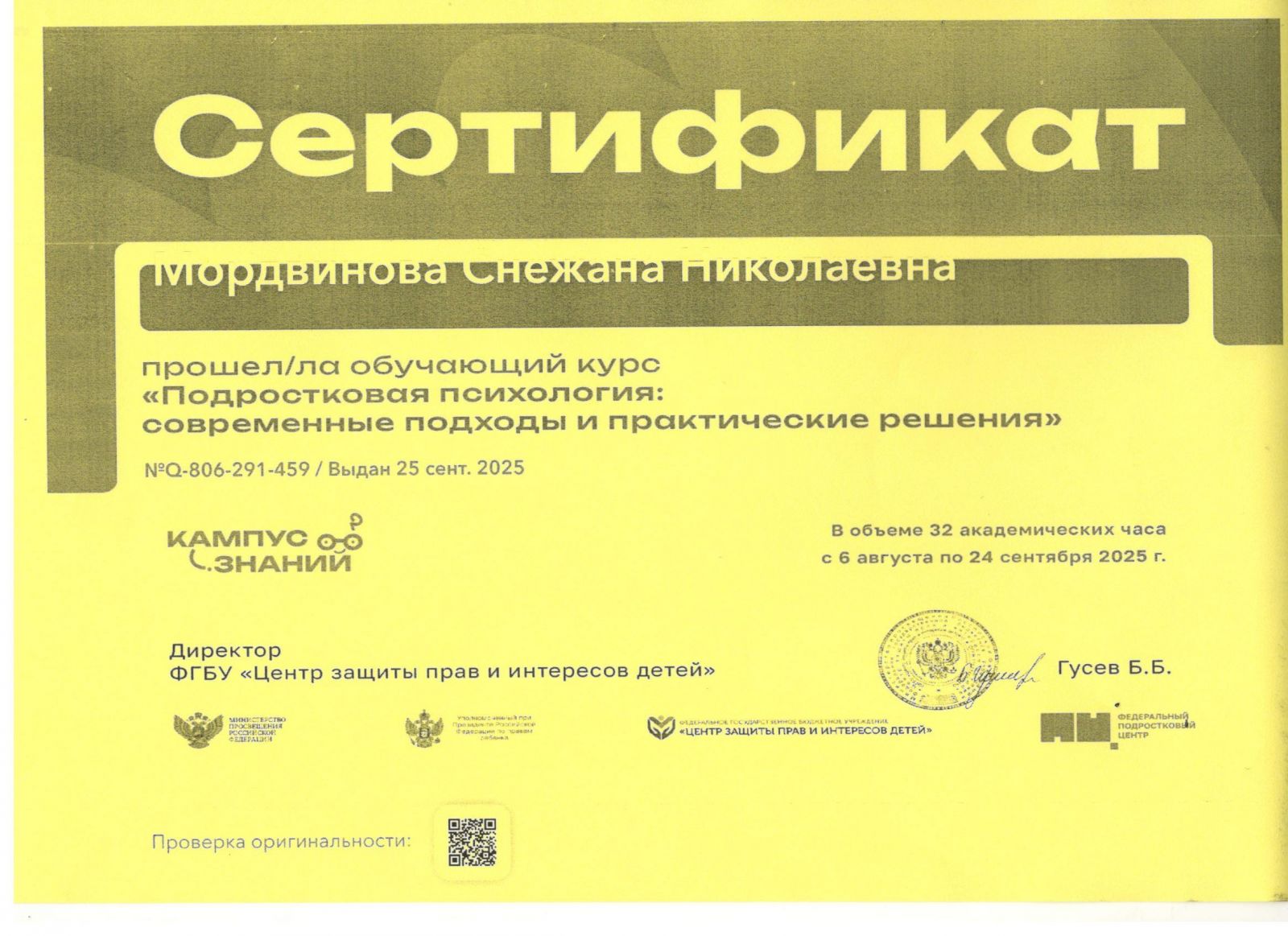 Сертификат Курс"Подростковая психология"