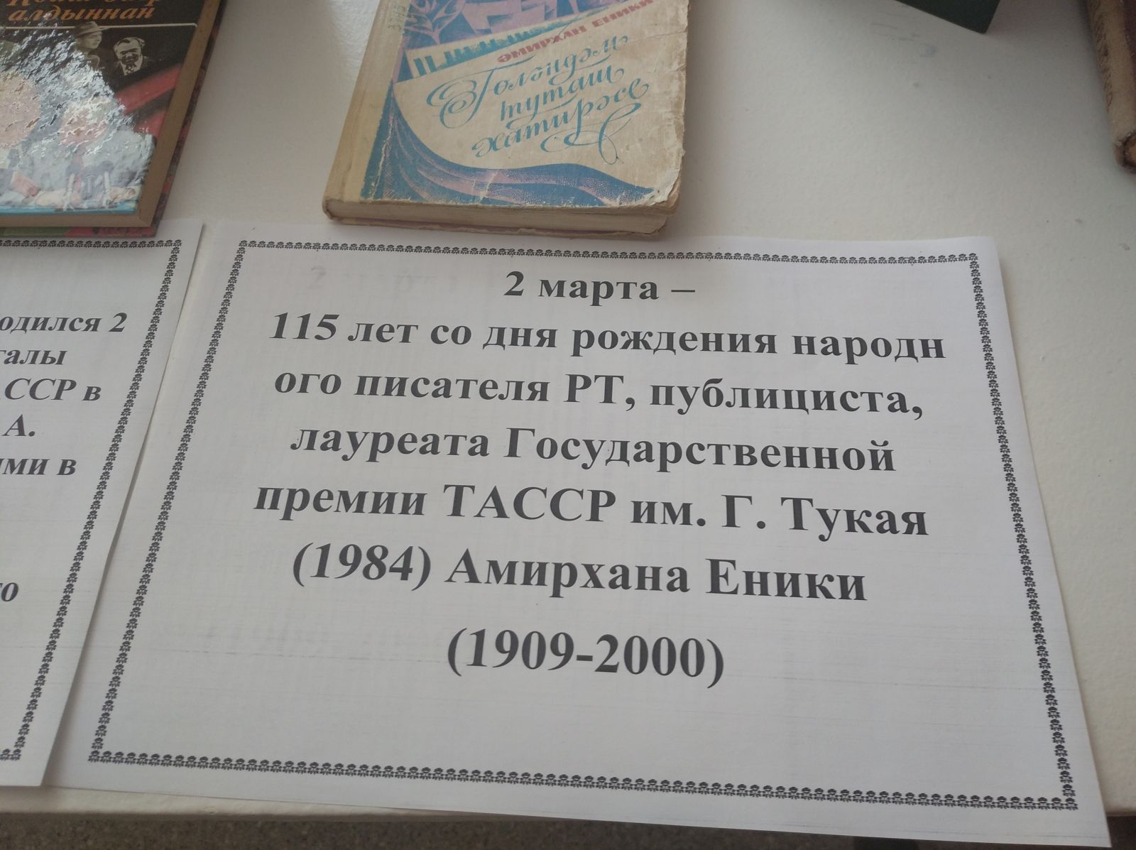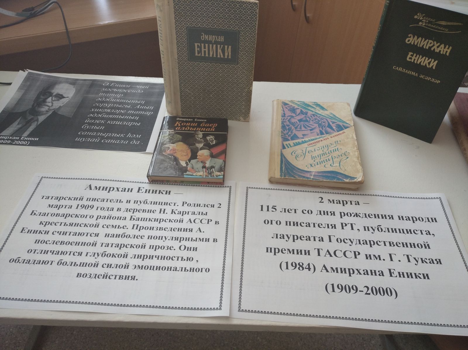 К 115–летию со дня рождения писателя в школьной библиотеке оформлена книжная выставка и обзор выставки. На выставке представлены произведения Амирхан Еники, имеющиеся в фонде библиотеки.