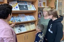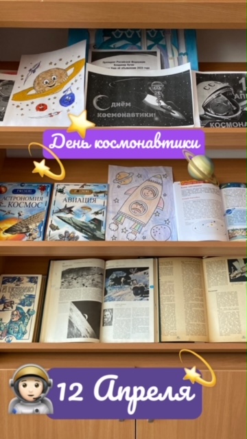 Ребята познакомились с книжной выставкой «Человек взмывает в космос».На ряду с книгами на выставке разместили рисунки учеников на тему космоса.