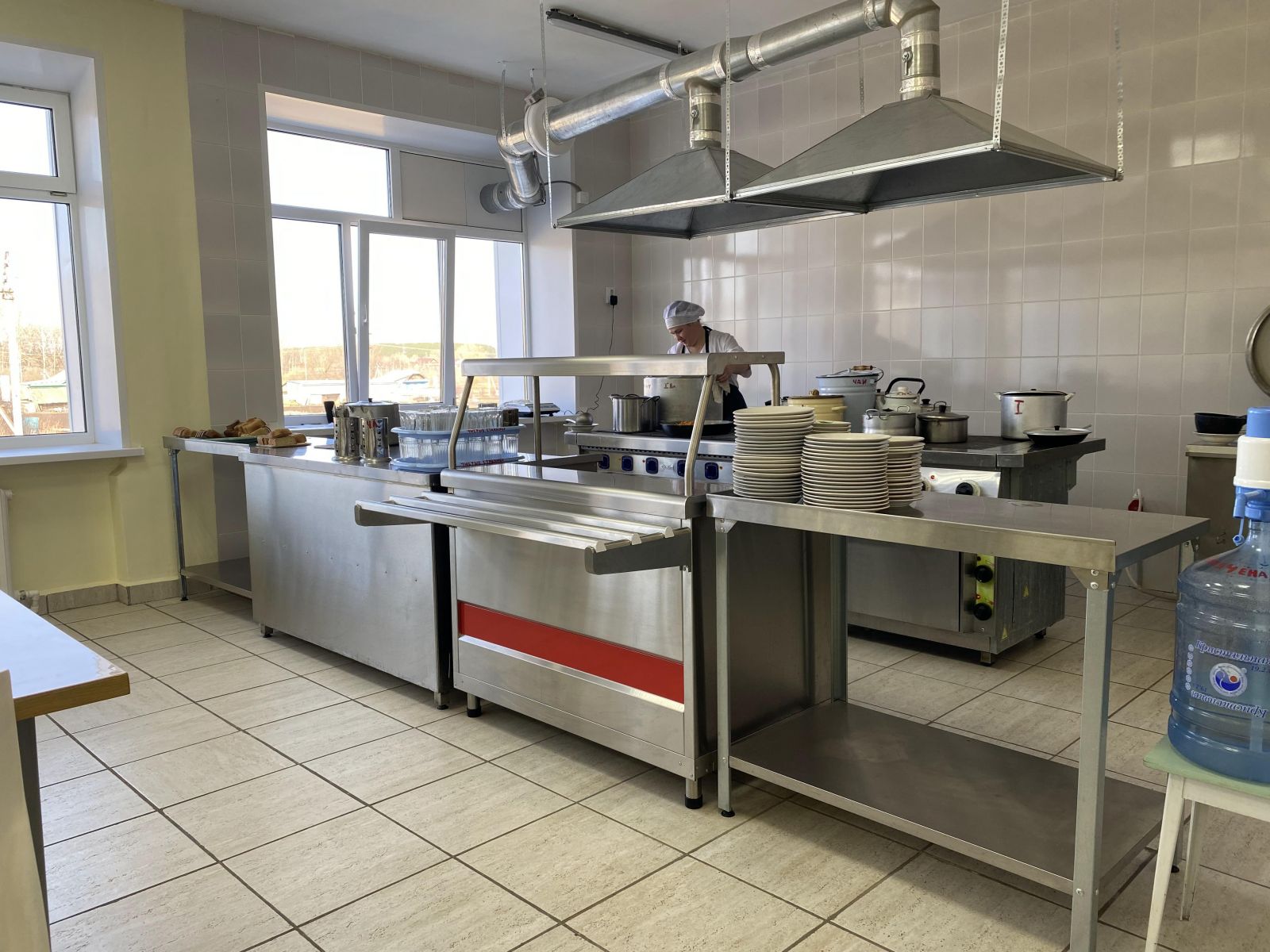 Приготовление поварами в школьной столовой горячего завтрака