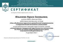 Поздравляем Юзыкаеву Ларису Зиновьевну - учителя МБОУ «Бимская СОШ» - победителя республиканского семинара-педагогических чтений «Формирование гражданской идентичности и патриотизма на уроках историко-обществоведческого цикла и во внеурочной деятельности», представившей мастер-класс на тему «Роль объединения туристско-краеведческой направленности в патриотическом воспитании школьников» в г.Нижнекамск РТ