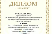 Поздравляем Галиева Ильдана — обучающегося 9 класса МБОУ Кичкетанская СОШ с ПОБЕДОЙ на Поволжской научной экологической конференции школьников им.А.М.Терентьева в номинации «Агроэкология»