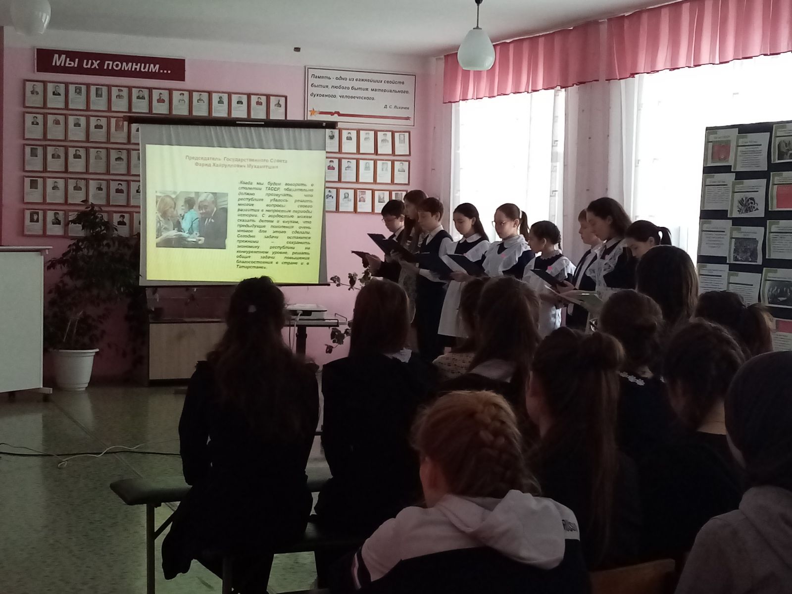 Далее Раиса Владимировна рассказала о дальнейших планах работы лицея. Обучающиеся 6 и 7 классов начали работу по созданию галереи портретов Героев Советского Союза - уроженцев Татарстана. Планируется создание галереи видеороликов "Я помню! Я горжусь!"