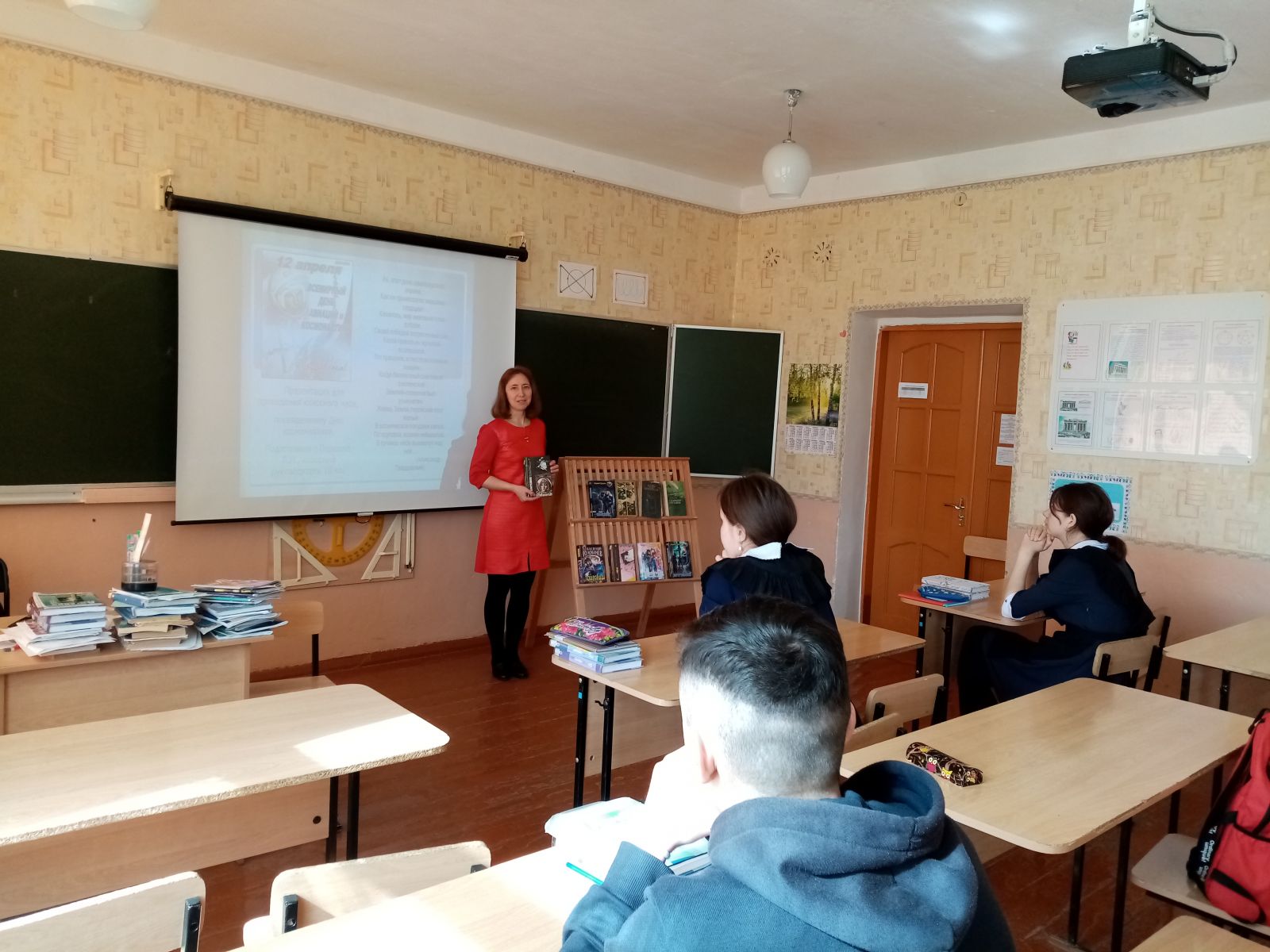 10 класс (кл. рук. Сабирова Л. Г.) - круглый стол "По страницам фантастических книг". Говорили о писателях-фантастах, оформили выставку книг. Посмотрели видеоматериал по теме "День космонавтики и авиации"