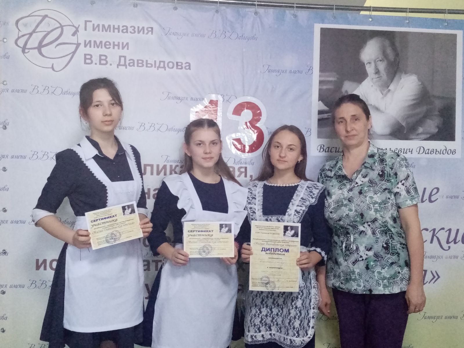 Маркитонова Екатерина (9 сыйныф), Васильева Оксана (9 сыйныф), Шагабиева Гөлназ (10 сыйныф) һәм Хатбуллина Иделия (8 сыйныф) Яр Чаллы Шәһәрендә узган "Кече Давыдов укулары"дип аталган XIII Республика фәнни-тикшеренү эшләре конференциясендә катнаштылар. Барлык катнашучылар да лаеклы чыгыш ясадылар, Маркитонова Екатерина җиңүче булды. Җитәкчеләрне Васильева Галина Алексеевна һәм Шәйдуллина Ләйсән Малик кызын котлыйбыз! Әти-әниләргә дә рәхмәт сүзләрен җиткерәбез