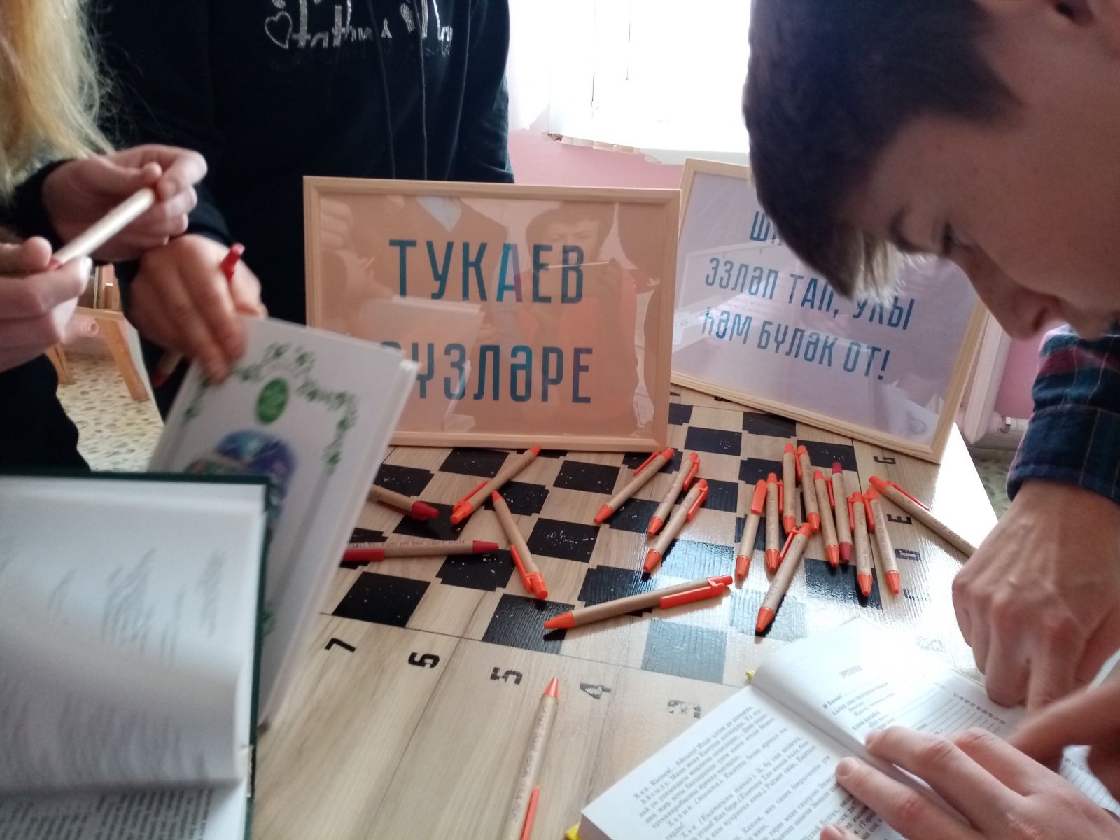 Проведенные внеклассные мероприятия сегодня были посвящены Тукаю. В проекте "Слова Тукая" приняли участие 5-10 классы.Строки, написанные на ручках, можно было найти в стихах и выиграть приз. Руководитель проекта Терентьева Люция Михайловна. Учащиеся 1 класса на библиотечном уроке читали сказки Г. Тукая, знакомились с его баснями. Педагог-библиотекарь Утехина Светлана Алексеевна подготовила выставку произведений поэта. Масштабное меропрятие "Библионочь" также открылось инсценированием произведения Г. Тукая. Воспитанники дошкольной группы Утехин Тимофей и Брюхова Анна рассказали наизусть стихотворение "Мотылек и ребенок".