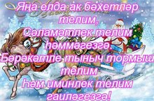 Яна ел белэн котлаулар кабул итеп алыгыз! Яңа ел бәйрәме матур булып үтсен! Алдагы өр-яңа ел бары бәхет-куанычлар гына алып килсен. Туасы таңнар тыныч булсын. Гомер юлларыбыз шатлык белән тулып торсын һәрчак. Кызыклы очрашулар, бәхетле мизгелләр күп булсын! Эшләребездә уңышлар юлдаш булсын, күңелләребездәге мәрхәмәтлелек бар җиһанны яктыртсын. Йортларыбызга авырулар, хәвеф-хәтәрләр, бәла-казалар килмәсен. Гаиләләребездә бәхет уты һәрвакыт сүнмичә янып торсын! Яңа ел белән сезне, киләсе еллар бәхет китерүче еллардан булсын!