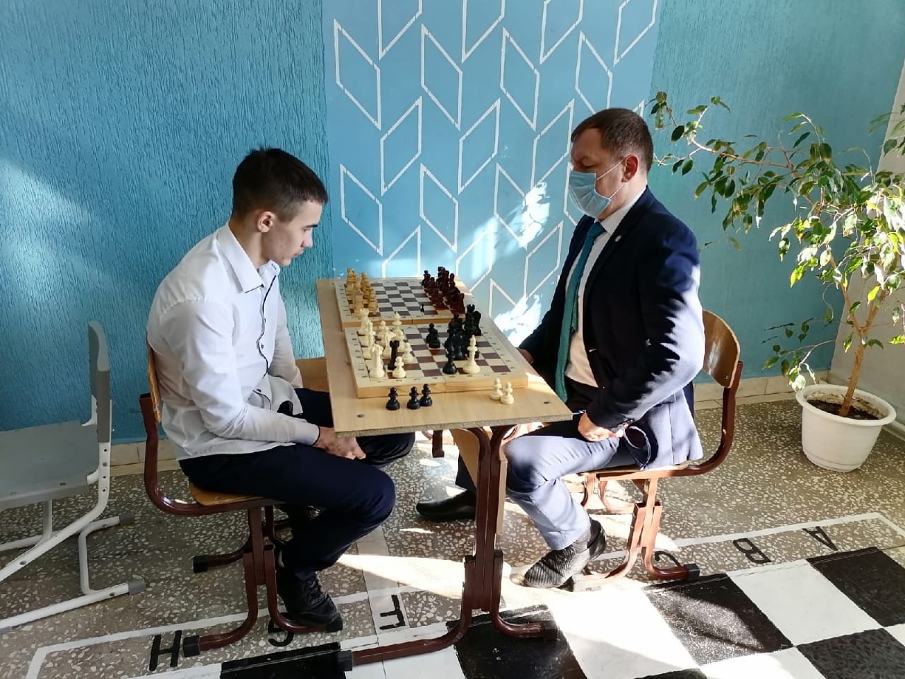 Азат Рөстәм улы "Үсеш ноктасы" цифралы һәм гуманитар профильле белем бирү үзәгенең "Шахмат" түгәрәге эше белән кызыксынды. Ул 10 нчы сыйныф укучысы Гильманов Ильяс белән шахмат уенында үз көчен сынап карады. Азат Рөстәмович Ильясның уен барышын җентекләп уйлавын, шуңа күрә аның белән уен интеллект өчен яхшы күнекмә булуын билгеләп үтте.