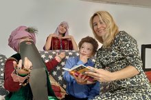 Насырова А. участвовала в номинации фоторабот: «А сочиню-ка я что-нибудь свое, Пушкин смог, и я смогу!»: вместе с детьми она читает поэму А.С.Пушкина «Руслан и Людмила», на фотографии показан момент представления младшим сыном образов Черномора и Людмилы в исполнении старших детей.