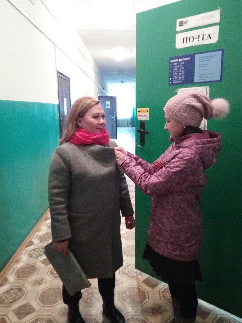 Сегодня ученики 7 класса провели акцию «Георгиевская ленточка» на территории села. Учащиеся прикрепляли Георгиевскую ленточку и рассказывали о том, что Акция стартовала 24 апреля, в ней принимают участие волонтеры, молодежь и учащиеся школ. Ребята напомнили рекомендации по ношению Георгиевской ленточки: не крепить на антеннах автомобилей и сумочках, не завязывать на волосы и руку, носить с уважением и честью на груди с левой стороны. Черный цвет означает дым, оранжевый – пламя. Ребята побывали в аптеке, в магазинах, на почте, в отделение МЧС и амбулатории.