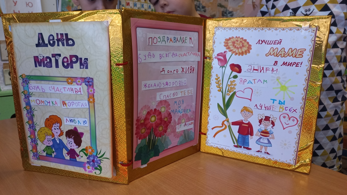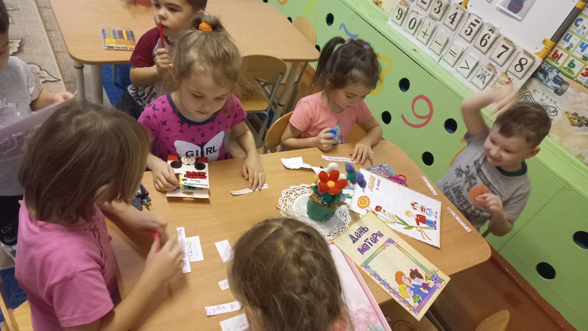 В детском саду проходит неделя, посвящённая Дню Матери. Ребята обсуждают почему для каждого из нас мама самый близкий человек, а также при помощи фантазии и цветного картона дети совместно с воспитателем готовят поздравительные открытки.