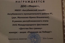 Министерство образование и науки РТ наградило ДОО "Мирас" (рук. Малюкова И.И.) грамотой в рамках республиканского этапа XVII Международного фестиваля "Детство без границ" конкурс - акция "Равнение на Победу!"