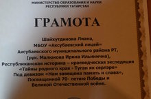 Шайхутдинова Лиана награждена грамотой МОиН РТ за участие в Республиканской историко-краеведческой экспедиции "Тайна родного края -Туган як серлэре" под девизом "Нам завещана память и слава", посвященной 70-летию Победы и Великой Отечественной войне.